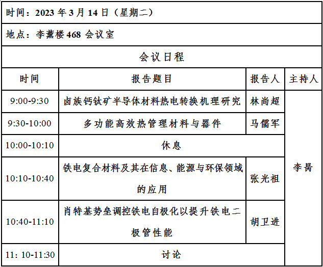 铁电体特有的极化效应及其对电场、应力和温度等激励的特殊极化响应使其集电卡、储能、压电和热释电特性于一身,在环保(新型电卡制冷)、能源(大功率储能)和信息(压力传感、红外探测)领域应用广泛。铁电材料理论研究、性能提升和应用发展的关键和难点在于极化行为的精确有效调控。报告人近年着重研究了多场耦合下铁电材料极化行为的调控机理,分析了铁电材料“成分/微结构-边界条件/界面效应-极化特性”的内在关系,旨在提高铁电陶瓷、聚合物、陶瓷-聚合物复合材料及其器件的综合性能。报告将就最近的研究结果进行总结与汇报。