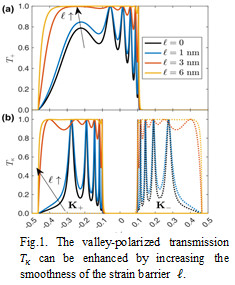 1) For the smoothed strain barrier [2], we explore the influence of strain on the valley-polarized transmission of graphene.When the transmission is along the armchair direction, we show that the valley polarization andtransmission can be improved by increasing the width of the strained region and increasing(decreasing) the extensional strain in the armchair (zigzag) direction. Furthermore, when we consider thesmooth strain barrier, the valley-polarized transmission can be enhanced by increasing thesmoothness of the strain barrier, as shown in Fig. 1.