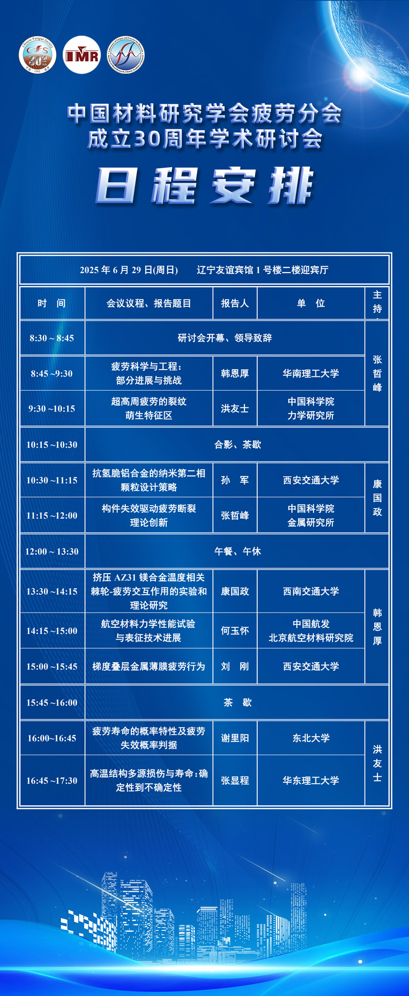 “中国材料研究学会疲劳分会成立30周年学术研讨会”于2025年6月28日-29日(28日下午与29日上午报到,29日全天学术研讨)在辽宁友谊宾馆召开,欢迎广大职工和研究生参会!