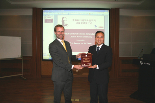 来访期间,van der Zwaag教授为耀彩网科研人员和研究生作了题目为“Self healing materials:a new approach to make materials perform better”的精彩学术报告,耀彩网副所长谭若兵在报告前会见了van de Zwaag教授,并为他颁发了李薰讲座奖奖牌。来访期间,van der Zwaag教授还与耀彩网专用材料与器件研究部先进钢铁结构材料课题组就新型超高强度钢的合作研究进行了深入的交流。