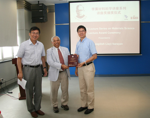 来访期间,卢柯所长、成会明常务副所长、杨锐副所长分别会见了Jagdish Narayan教授。李薰讲座奖颁奖仪式于7月20日举行,卢柯所长主持了颁奖仪式,成会明常务副所长为Jagdish Narayan教授颁发了李薰讲座奖奖牌。颁奖仪式后,Jagdish Narayan教授为我所科研人员和研究生作了题目为“Frontiers in Nanostructured Materials for Next-generation Nanotechnology”的精彩报告,报告引起了与会研究人员和研究生的浓厚兴趣,报告后的提问环节气氛热烈,大家就感兴趣的问题与Narayan教授进行了积极讨论。