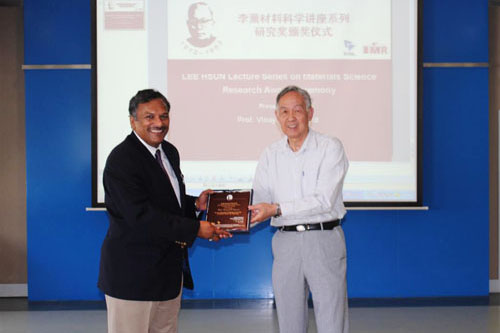 叶恒强院士(右)为Vinayak P. Dravid 教授(左)颁发了李薰研究奖奖牌