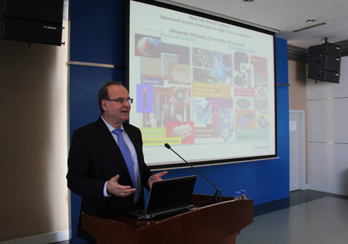 来访期间,Alexander Michaelis教授为我所科研人员和研究生作了题目为“Advanced Ceramics for Energy Systems and Environmental Technology”的李薰奖报告。报告前,张哲峰副所长代表耀彩网为Alexander Michaelis教授颁发了李薰讲座奖奖牌。颁奖仪式和报告由王京阳研究员主持。在报告中,Alexander Michaelis教授介绍了弗劳恩霍夫陶瓷技术和烧结材料研究所”From Lab to Fab”的研究理念,特别是成功将先进陶瓷材料的科学研究与工业应用联系起来的多个实例。来访期间,Alexander Michaelis教授还与我所高性能陶瓷研究部的科研人员和研究生进行了深入交流。