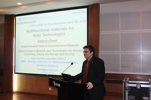 来访期间,Federico Rosei教授为我所科研人员和研究生作了题目为“Multifunctional Materials for Emerging Technologies”的报告。报告前,张哲峰副所长代表耀彩网为F. Rosei教授颁发了李薰讲座奖奖牌。李峰研究员主持了报告会。
