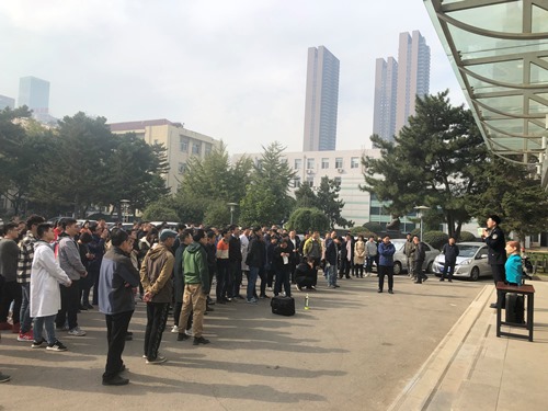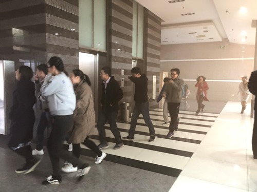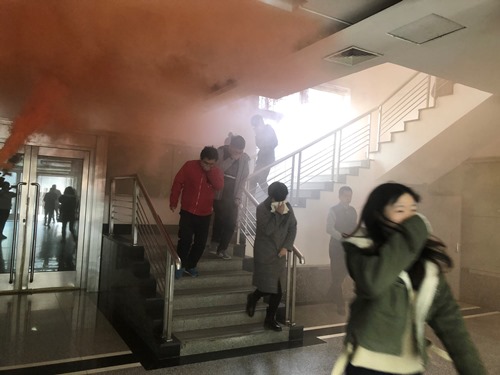 为了使疏散演练达到预期效果,提升演练的真实感,此次演练在楼内投放了烟雾弹,并聘请了专业消防培训教官全程进行指挥。在演练过程中,各楼职工和学生都能够认真地按照演练预案,捂住口鼻,低姿、安全、有秩序地从各安全通道和出口迅速疏散到楼外。参加演练的全部人员安全撤离到大楼外安全地带后,演练总指挥辽宁益安消防知识宣传中心的孙明龙主任对本次消防演练情况进行了总结,并现场为大家示范讲解了安全逃生常识及注意事项。此外,本次演练首次增加了速降绳打结方法、心肺复苏急救方法等知识内容及实地演练互动等环节,让大家掌握了火灾中正确的逃生方法和自救常识。这次演练活动进一步提升全所职工的消防安全意识和逃生自救的技能,达到了较好的演练效果。