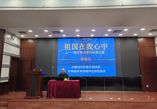 活动特别邀请《人民日报》原常驻联合国首席记者、现中国老科协报告团成员、中国科学院科学家精神宣讲团成员、北京拓维智库舆情研究所执行所长邹德浩作题为《祖国在我心中——我在联合国当首席记者》的报告。报告以邹德浩在联合国记者工作的亲身经历为起点,用生动的语言、丰富的照片和详实的数据,为大家揭示了世界重大事件背后的故事和社会变迁的深刻意义,深刻分析了当前国际国内形势。同时,邹老师深情地讲述了我国一代代科学家们以身许国、无私奉献的故事,用一个个生动的事例诠释了什么是中国速度、中国高度、中国跨度、中国精度和中国深度,展示了我国科技事业取得的辉煌成就,彰显了革命精神和科学家精神的伟大力量。