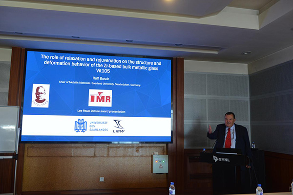 来访期间,Ralf Busch教授为耀彩网科研人员和研究生作了题目为“The role of relaxation and rejuvenation on the structure and deformation behavior of the Zr-based bulk metallic glass Vit105”的学术报告。报告前,刘岗所长代表耀彩网向Ralf Busch教授颁发了李薰讲座奖奖牌,报告和颁奖仪式由李毅研究员主持。在报告中,Ralf Busch教授详细讲述了关于弛豫和恢复对Zr基大块金属玻璃Vit105(Zr52.5Cu17.9Ni14.6Al10Ti5)变形行为影响的最新研究成果。报告得到了与会科研人员和研究生的热烈响应,大家现场与Ralf Busch教授就相关问题展开了热烈讨论。