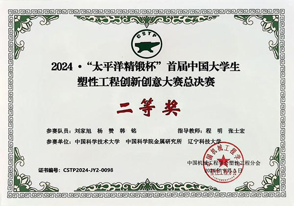 日前,在张士宏研究员和程明正高级工程师指导下,我所博士生刘家旭、硕士生韩铭和辽科大硕士生杨赞合作的作品《GH4169合金双榫头叶片短流程制备工艺》在首届中国大学生塑性工程创新创意大赛中获得二等奖。