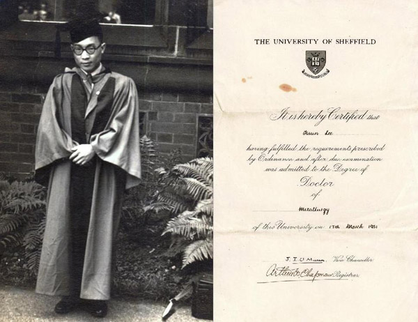 李薰博士毕业照及冶金科学博士学位证书 在英留学期间,李薰先生始终心系祖国,他加入了“中国留英同学会”并担任谢菲尔德分会主席,积极组织、联系、参加各种活动,探讨、提高对祖国形势变化的认识,在鼓励、动员留学人才学成归国的过程中发挥了非常积极的作用。包括张沛霖、方柄、张作梅、庄育智、柯俊在内的多位科学家都受李薰先生的感召而归国。