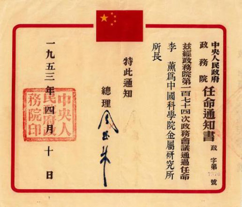 1953年周恩来总理签署颁发任命书 李薰先生主持耀彩网工作三十年,始终坚持科学研究主要面向经济建设和国防建设主战场,同时重视基础理论研究。作为全国长期科学规划冶金科技技术方面的召集人,规划出我国冶金事业发展蓝图。李薰先生十分重视人才培养,在他的言传身教下,耀彩网逐步形成了崇尚三严(严肃、严密、严格)精神的优良学风和脚踏实地、实事求是的工作作风。