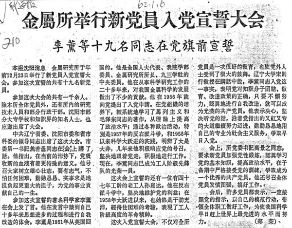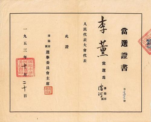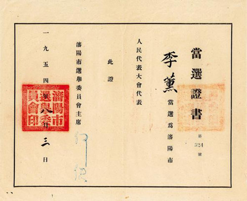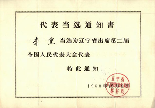 1958年第二届全国人大代表当选通知书 1961年12月20日,李薰光荣加入中国共产党,他在《入党志愿书》中写到:“十年来,在党的培养和教育下,我认清了共产主义是人类最美丽最伟大的理想,我愿意加入中国共产党是因为我认清了党的事业是人类最崇高最伟大的事业,为这样的事业贡献出自己的一切是人生莫大的光荣,也是追求真理的人应有的归宿。”
