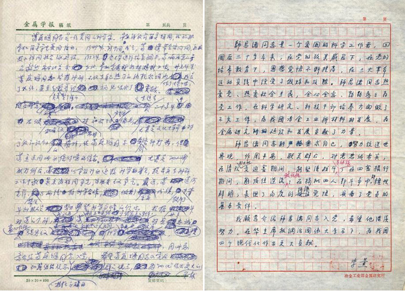 李薰为葛庭燧、师昌绪撰写的入党介绍信手稿