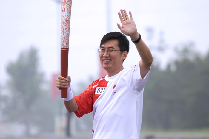 2008年7月17日,卢柯院士作为科技界代表参加奥运圣火在沈传递活动。图为卢柯院士手持奥运火炬向大家挥手致意。