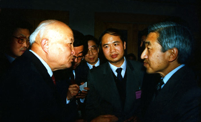 1992年日本明仁天皇在中国科学院参观时与师昌绪交谈