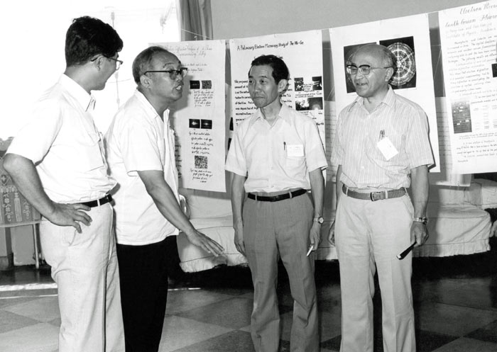 在中日国际电镜学术会议上郭可信同日本科学家进行热烈讨论