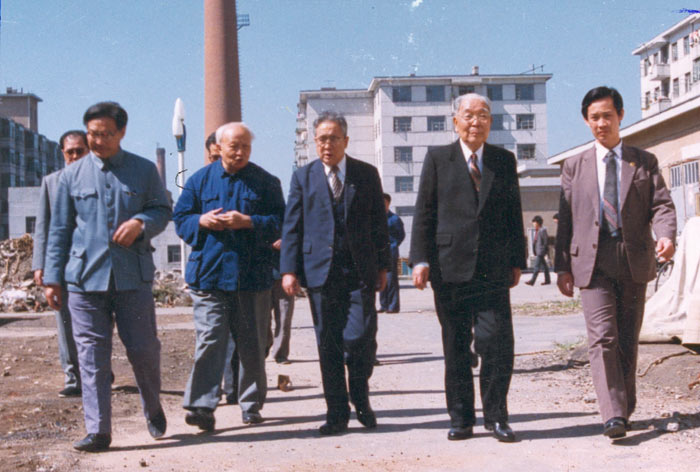 1987年腐蚀所建成运行,师昌绪所长(左二)、刘寿荣副所长(左一)陪同全国人大常委会副委员长严济慈(右二)、国家科委顾问武衡(中)来所视察。