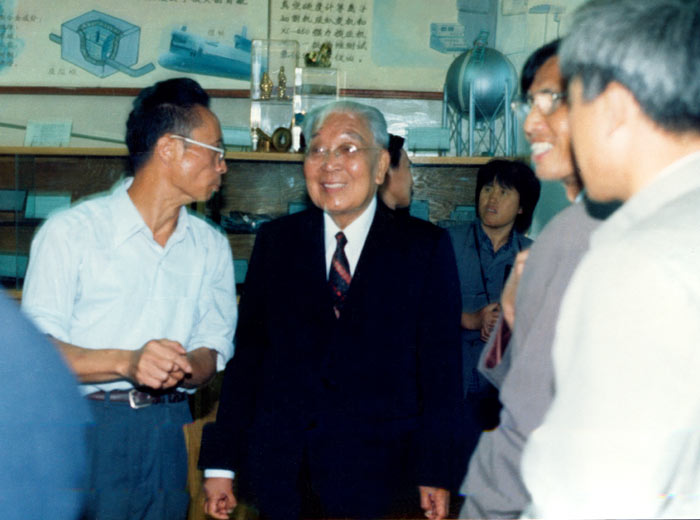 全国人大常委会副委员长严济慈(左二)到所视察,图为徐曾基所长(左一)在所成果展室汇报科研工作和取得的研究成果情况。