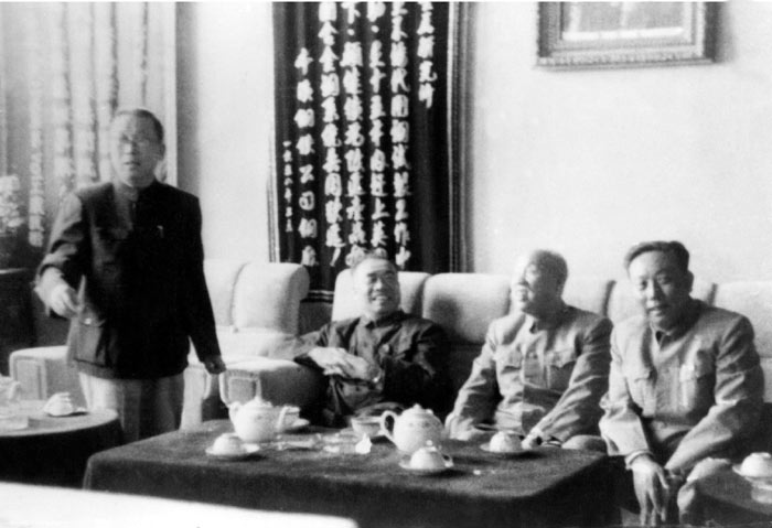 李薰所长(左一)向朱德委员长(左二)、国家副主席董必武(左三)汇报所工作情况。