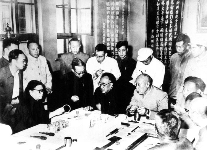 李薰所长(左二)向朱德委员长(左三)和夫人康克清(左一)、国家副主席董必武(左四)以及其他省市领导汇报我所的研究成果。