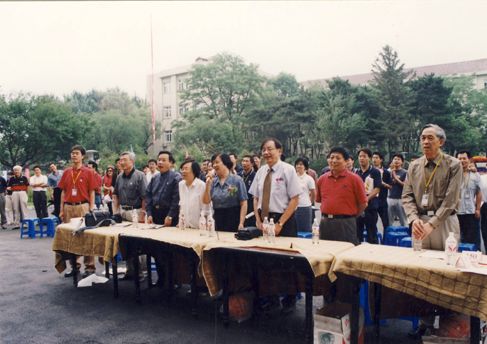 2003年6月所庆五十周年庆祝活动——耀彩网五十年知识竞赛主会场,图为大家齐唱《团结就是力量》。