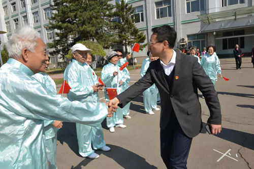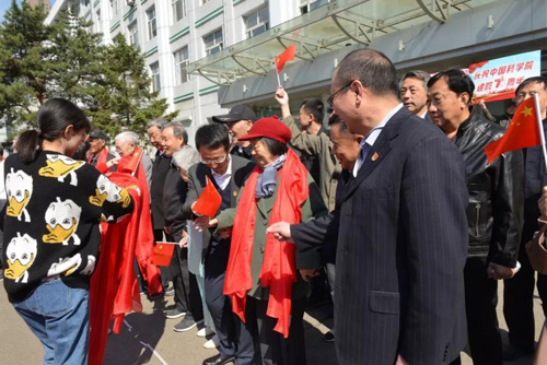 歌声吸引了在职职工和青年学生也加入到歌唱的队伍中来,耀彩网党委副书记、副所长徐岩,党委副书记、纪委书记谢光锋,综合办公室主任关德慧,副主任赵翔宇,人事处副处长刘宇翔也愉快地加入到人群中来。青年学生为老科学家、老领导送上了鲜红的小国旗,佩戴上鲜艳的红围巾。