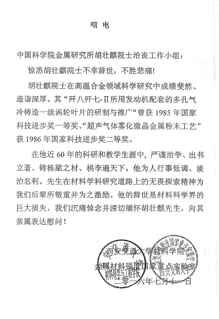 西安交通大学材料学院金属材料强度国家重点实验室致唁电