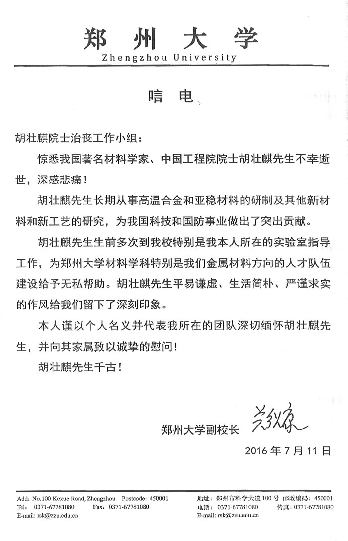 郑州大学副校长关绍康致唁电