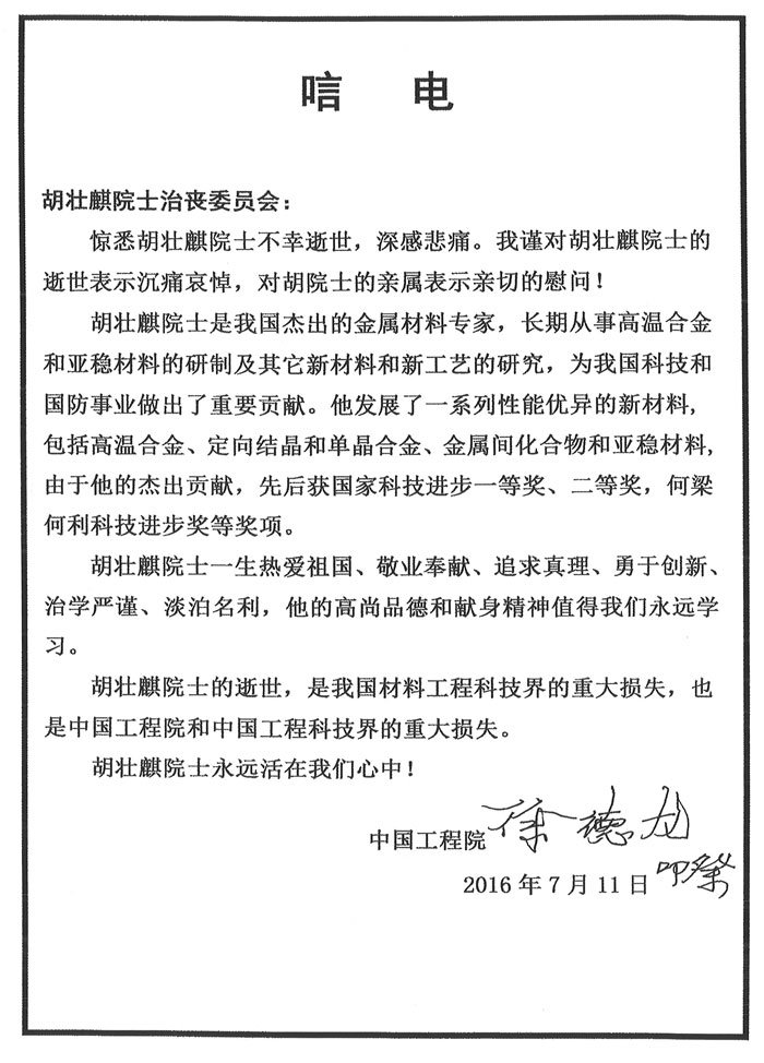中国工程院副院长徐德龙致唁电