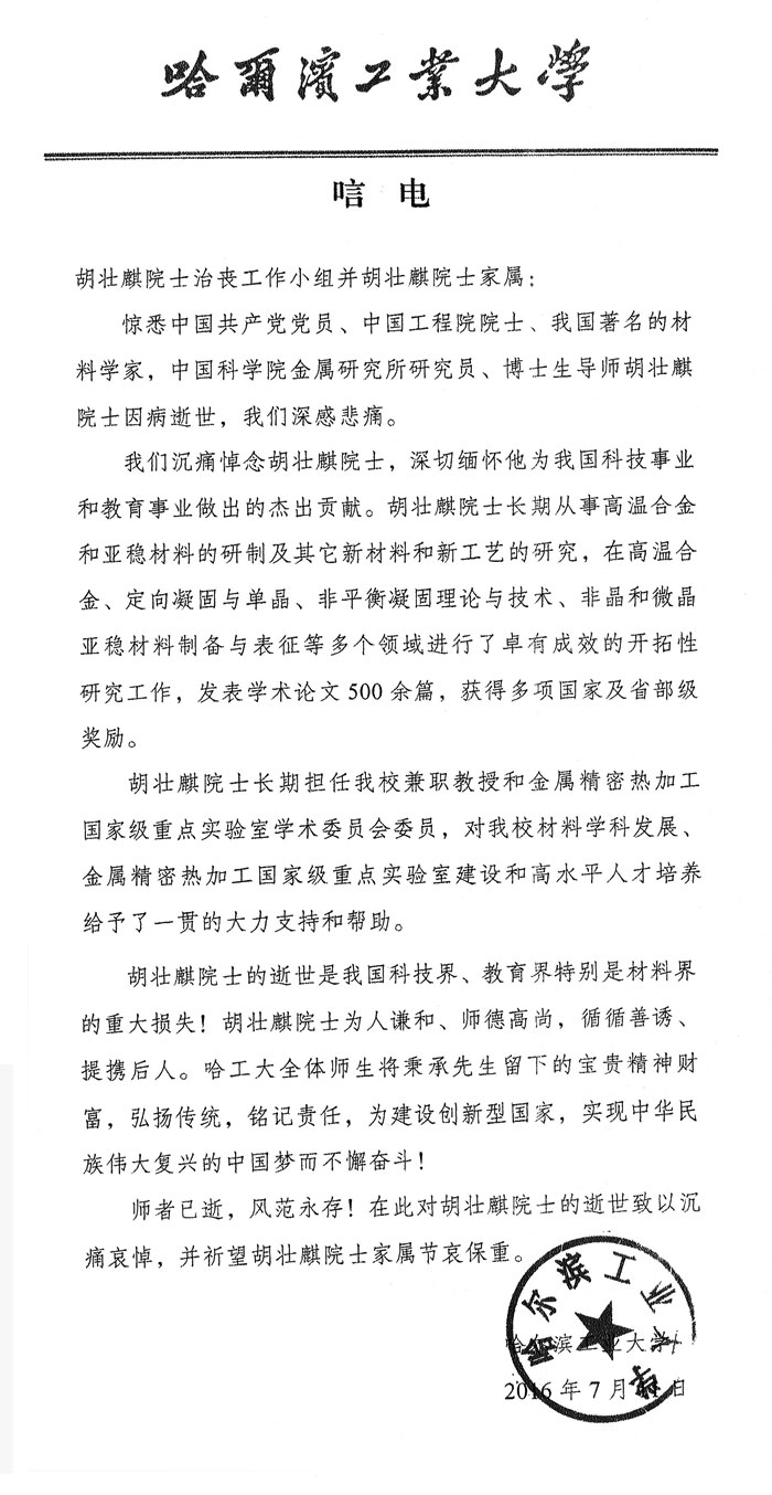 哈尔滨工业大学致唁电