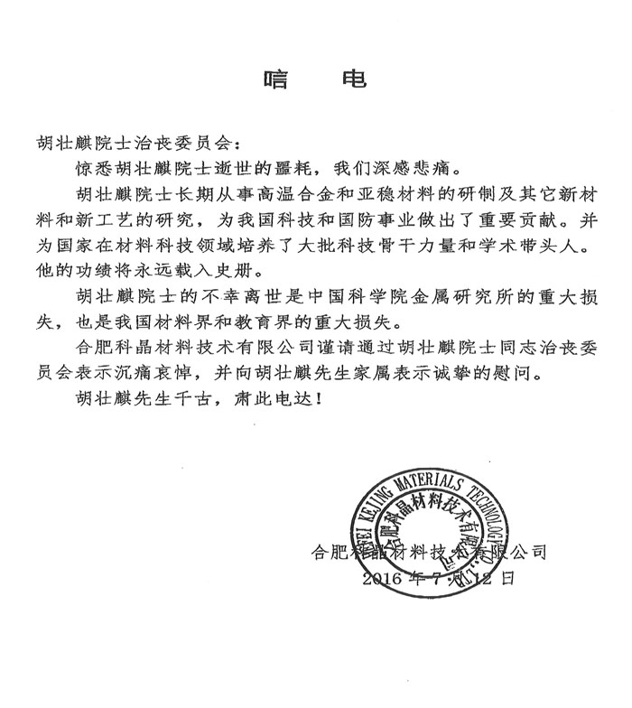 合肥科晶材料技术有限公司致唁电