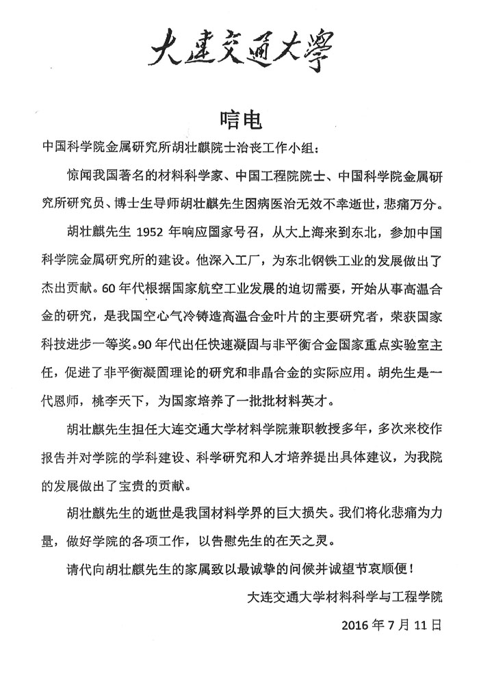 大连交通大学致唁电
