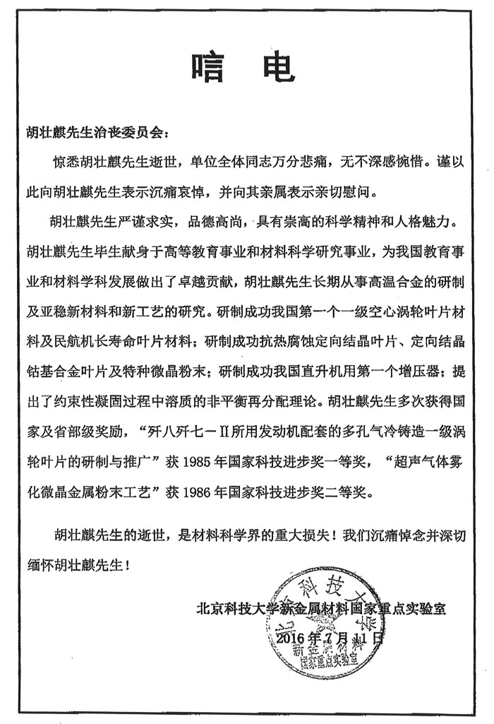 北京科技大学新金属材料国家重点实验室致唁电