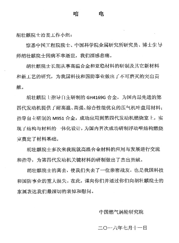 中国燃气涡轮研究院致唁电