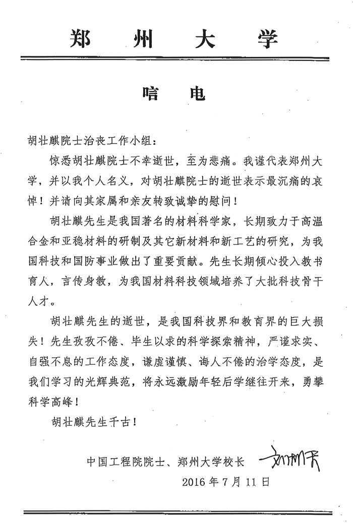 中国工程院院士、郑州大学校长刘炯天致唁电