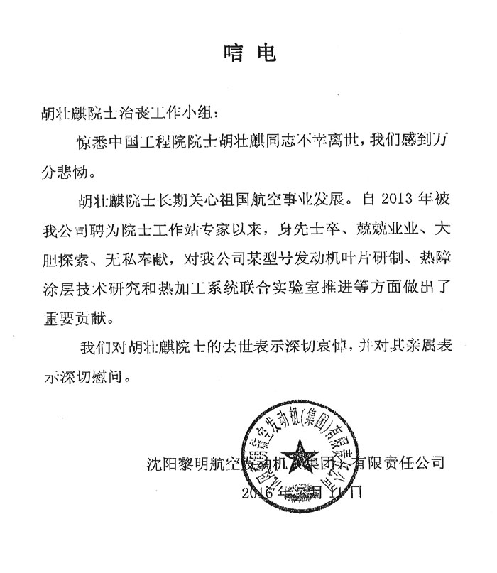 沈阳黎明航空发动机(集团)有限责任公司致唁电