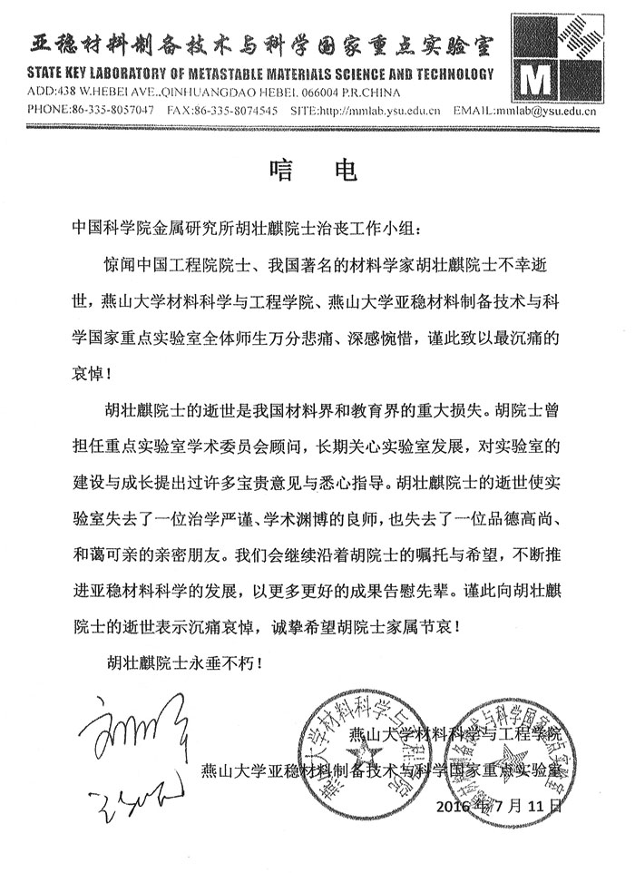 燕山大学材料科学与工程学院、燕山大学亚稳材料制备技术与科学国家重点实验室致唁电