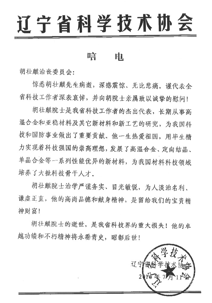 辽宁省科学技术协会致唁电