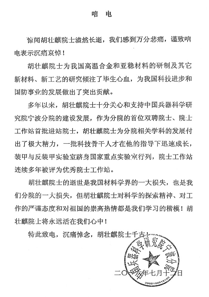 中国兵器科学研究院宁波分院致唁电
