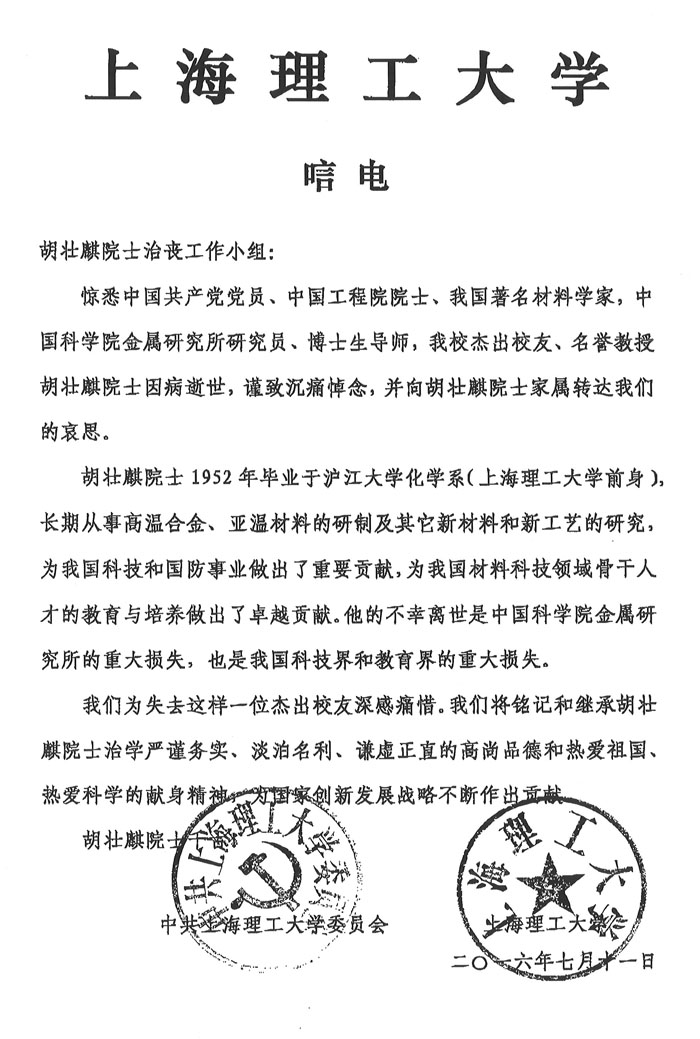 上海理工大学致唁电
