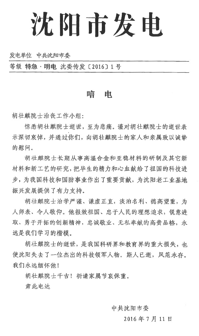 中共沈阳市委致唁电