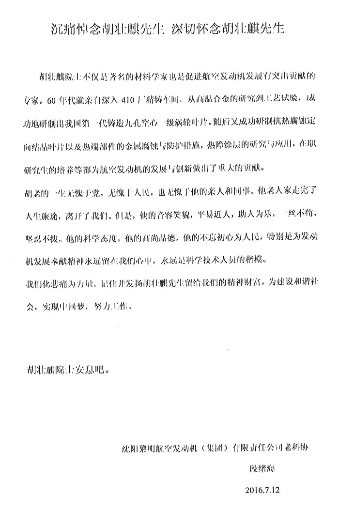 沈阳黎明航空发动机(集团)有限责任公司老科协段绪海撰文悼念