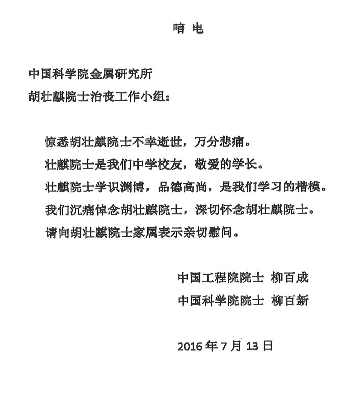 中国工程院院士柳百成、中国科学院院士柳百新致唁电