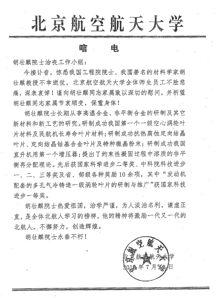 北京航空航天大学致唁电