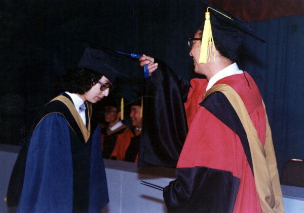 1993年在首届学位授予仪式上,胡壮麒研究员为获得硕士学位的学生授予硕士学位并颁发毕业证书