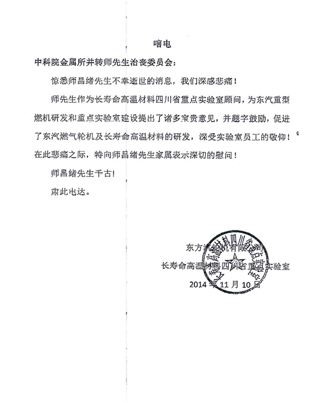 长寿命高温材料四川省重点实验室致唁电