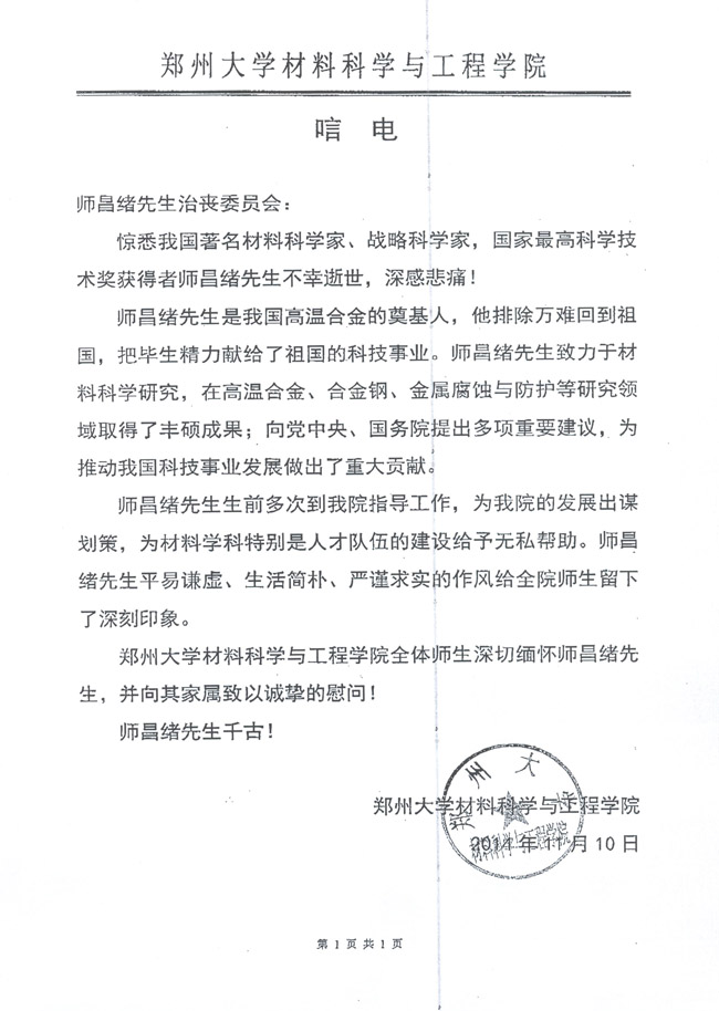 郑州大学材料科学与工程学院致唁电