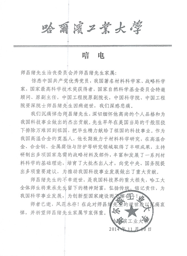 哈尔滨工业大学致唁电