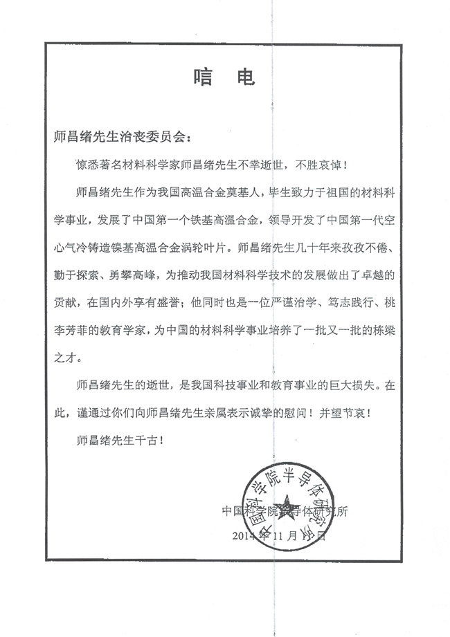 中国科学院半导体研究所致唁电