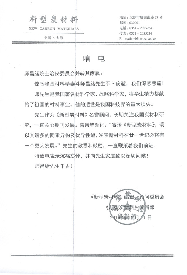 《新型炭材料》编辑、顾问委员会,《新型炭材料》编辑部致唁电