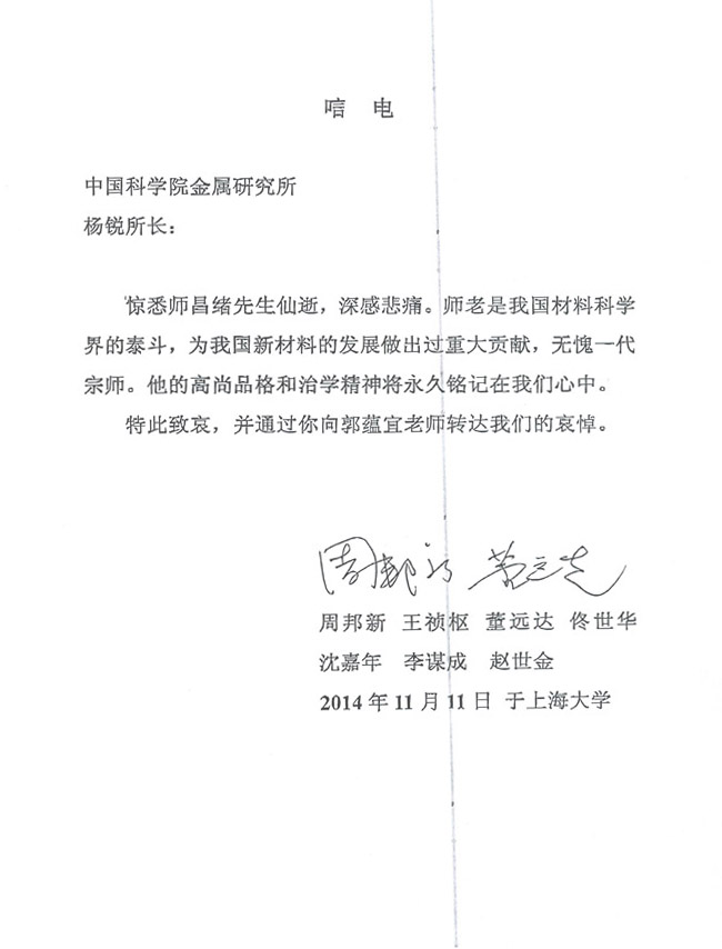 周邦新、王祯枢、董远达、佟世华、沈嘉年、李谋成、赵世金致唁电
